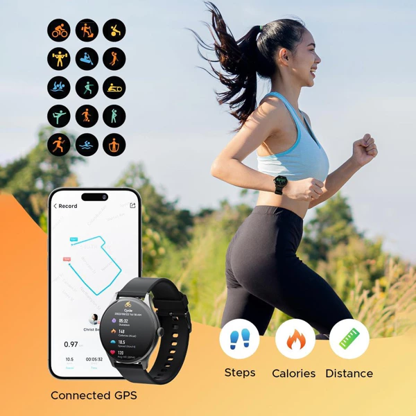 Función de llamada Bluetooth Disfruta de la comodidad de un teclado, contactos e historial de llamadas integrados. Mantenerte conectado con el mundo nunca ha sido tan fácil, incluso en movimiento. Notificaciones inteligentes Con notificaciones de mensajes personalizables, puedes mantenerte al día mientras te concentras en lo que realmente importa. Toma el control de tu vida…